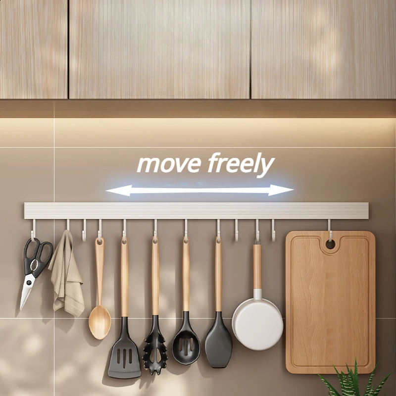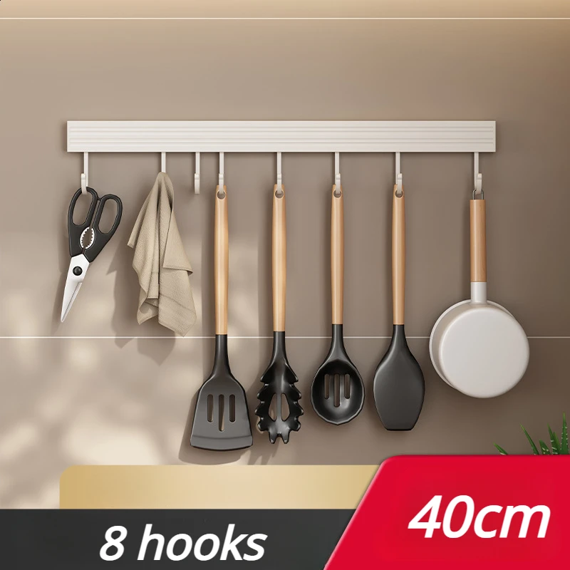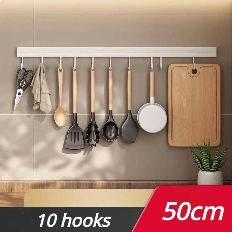 20/30/40/50cm White Kitchen Hook Holder No Punch Wall Hanging Rod Space Aluminum Row Hook Spatula Spoon Shovel Storage Rack