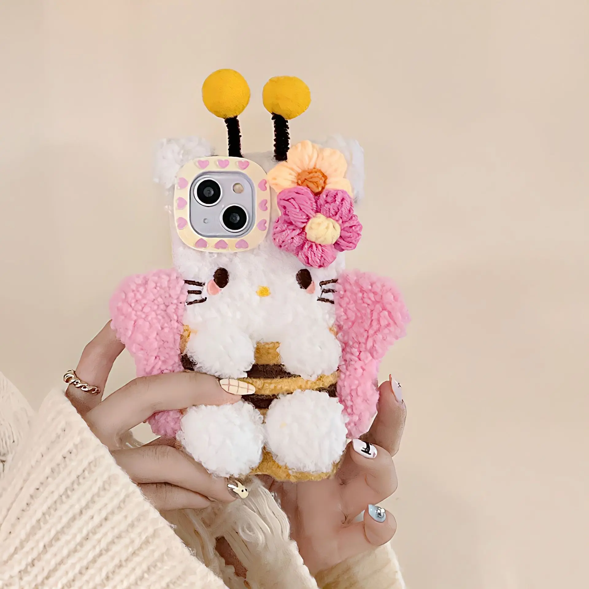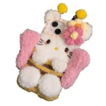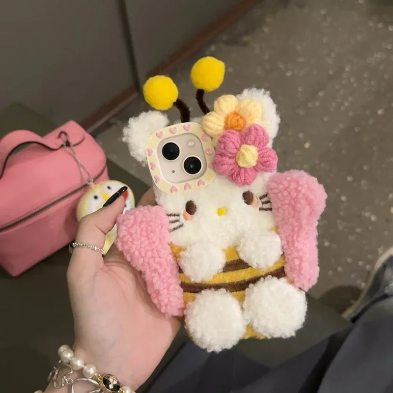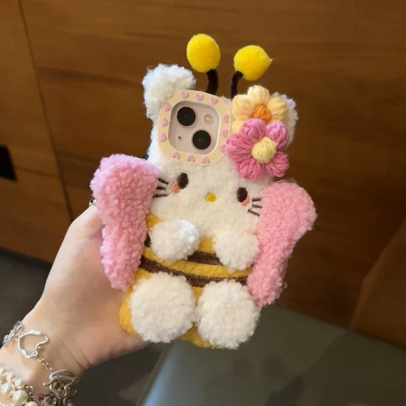 Plush Hello Kitty Phone Case Cartoon Bee Sanrio Iphone15 14 13 12 11 Pro Max Phone Case Cute 3D Winter Warm Shockproof Drop Case