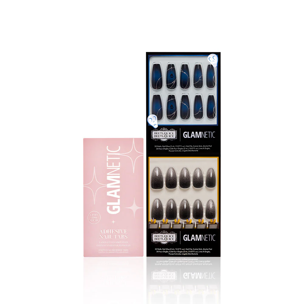 Glamnetic is thrilled to roll out the black-and-white carpet for our most phantasmic collaboration yet: Beetlejuice Beetlejuice™ x Glamnetic collection. Inspired by this fall’s highly anticipated film, this collection is a nod to the iconic, the mystical, and the outright fantastical elements of the film. With 5 hair-raising nail sets that feature 3D accents, designs underneath, and a new magnetic velvet finish + 1 brush-on nail glue, tailored for those who want to add a twist of “strange and unusual” nostalgia and spooky season vibes to their look.
